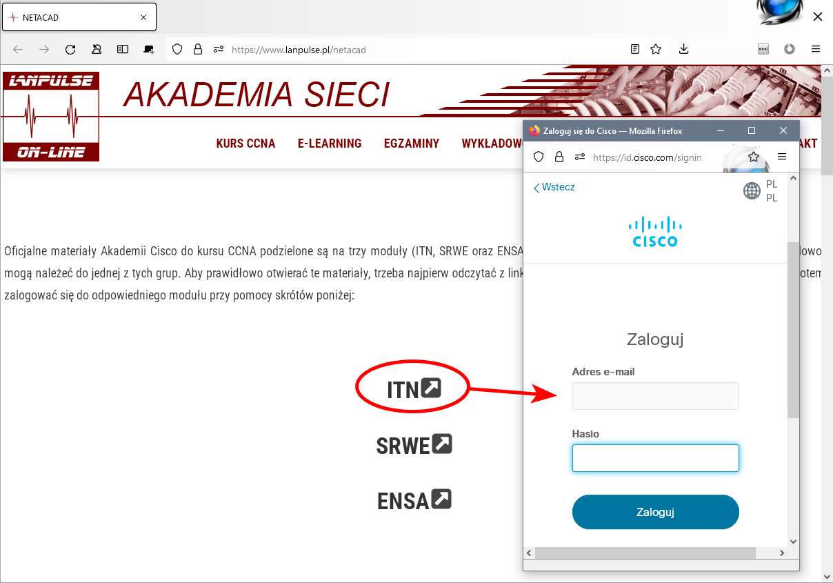 Aby prawidłowo otworzyć materiały z pierwszego linka trzeba najpierw odczytać, do którego modułu ten temat należy - w środku tego linka znajduje się nazwa modułu, odczytujemy więc ".../itn/...". Teraz przed kliknięciem w tego linka musimy najpierw zalogować się do modułu ITN materiałów Cisco używając skrótu ITN z górnej części strony LANPULSE NETACAD. Otworzy się wtedy dodatkowe okienko logowania: