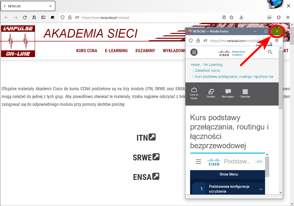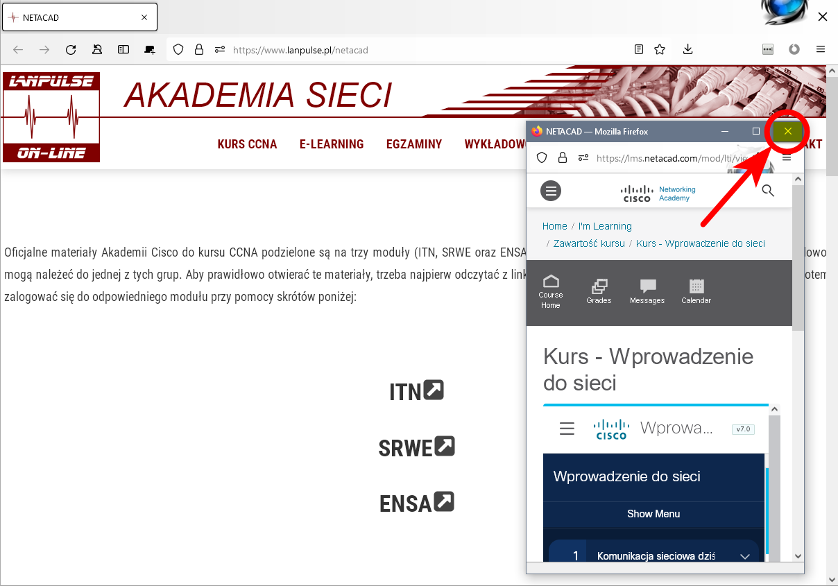 Jeśli w którymś momencie przestaną się prawidłowo otwierać materiały Akademii Cisco, a zamiast tego będą się pojawiały puste strony lub dziwne błędy, to należy zamknąć wszystkie okna przeglądarki i ponownie zacząć od strony LANPULSE NETACAD ze skrótami do logowania do poszczególnych modułów, zalogować się do wybranego modułu i ponownie otworzyć link do materiałów.