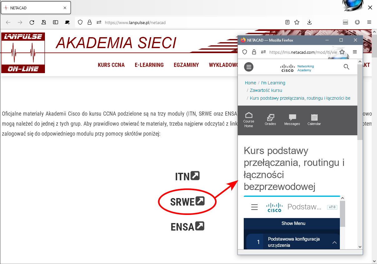 Oficjalne materiały Akademii Cisco do kursu CCNAv7 podzielone są na trzy moduły (ITN, SRWE oraz ENSA). Linki do materiałów, które Państwo otrzymujecie mailowo, mogą należeć do jednej z tych grup. Aby prawidłowo otwierać te materiały, trzeba najpierw odczytać z linku informację, do którego modułu dany temat należy, a potem zalogować się do odpowiedniego modułu przy pomocy skrótów poniżej: