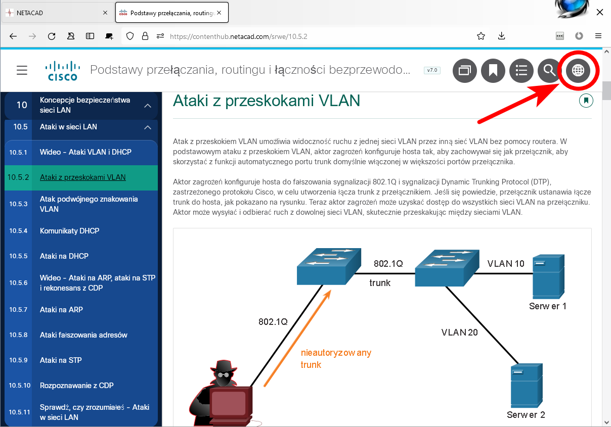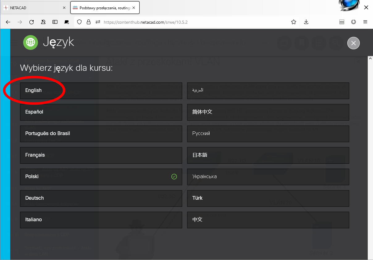 Materiały do kursu CCNA na portalu Akademii Cisco są domyślnie w wersji językowej polskiej, ale można również czytać je w oryginale. Aby zmienić wersję językową, na dowolnej otwartej podstronie wystarczy kliknąć na ikonę w prawym górnym rogu: